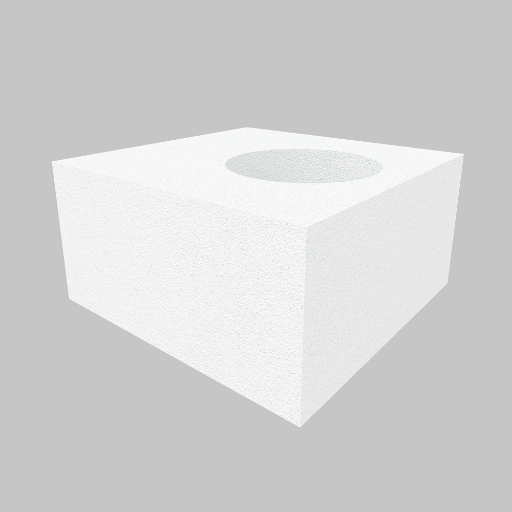 Газобетонный O-блок имеет размер 375 мм, а диаметр отверстия составляет 250 мм.